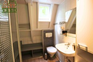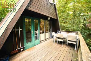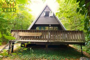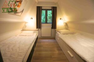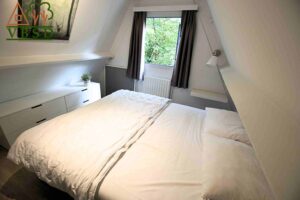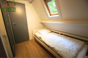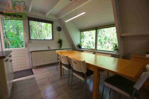 Op een hoge rug van het park ligt bungalow 46 aan een doodlopende en onverharde weg. De auto kan op een eigen parkeerplaats geparkeerd worden. Langs de bungalow wandelt u naar de entree. Achter een fijn verhard gedeelte waar vanuit de bungalow betreedt kan worden. De mooie lichte keuken bevindt zich aan de rechterkant. Deze is voorzien van een vaatwasser. Links van de hoekkeuken is de eetkamer. Door de dakkapel daar is er een fijn uitzicht op het groen dat deze bungalow omringt. Het hele huis straalt rust uit, de kleurstelling en de hoge mate van afwerking in de woonkamer zorgen ervoor dat hier een echt vakantiegevoel over je heen valt. De woonkamer heeft een mooi uitzicht op het goed gelegen balkon en geniet van veel privacy. De slaapkamers boven zijn ook rustig en stijlvol ingericht en zijn voorzien van centrale verwarming.